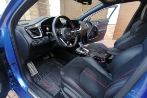 • Sportowe fotele, tapicerka skórzano – zamszowa w kolorze czarnym z emblematem GT, czerwone przeszycia foteli, boczków drzwi, kierownicy, drążka zmiany biegów