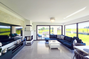 - Strefa dzienna to otwarta przestrzeń, w której kuchnia harmonijnie łączy się z jadalnią i salonem. Duże przeszklenia sprawiają, że wnętrze jest pełne naturalnego światła, a z salonu można wyjść bezpośrednio na zadaszony taras, idealne miejsce na rodzinne spotkania czy relaks po dniu pełnym obowiązków.