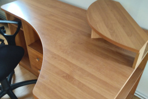 Sprzedam duże, solidne biurko narożne 135x95. Biurko posiada normalne ślady użytkowania, niepoobijane. W zestawie lub oddzielnie fotel biurowy dla dziecka (150 zł). Cena do małej negocjacji.