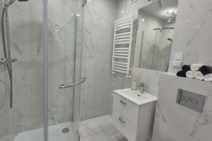 Łazienka utrzymana w jasnej, nowoczesnej stylistyce, kabina prysznicowa, zabudowa pod umywalką i stonowane oświetlenie tworzą eleganckie, relaksujące wnętrze.