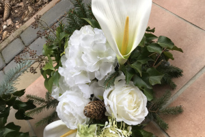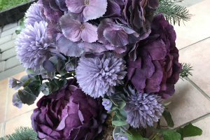 Kompozycja ułożona ze sztucznych kwiatów na żywym podkładzie , na elemencie drewnianym