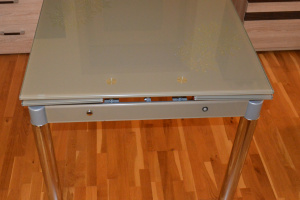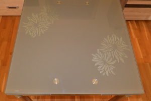 Sprzedam stół rozkładany. Blat jest ze szkła hartowanego jest na nim wzór kwiatowy, nogi są z metalu chromowanego. Rozmiar 80 cm x 80 cm, po rozłożeniu 130 cm x 80 cm.