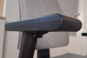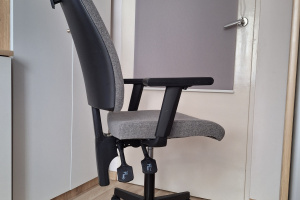 Fotel biurowy marki Nowy Styl z wygodnym zagłówkiem. Fotel używany, ale w dobrym stanie, ślady użytkowania widoczne jedynie na podłokietnikach. Tapicerka nie ma żadnych śladów użytkowania, materiał trwały i wytrzymały.