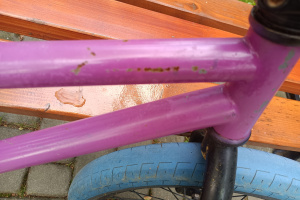 Rower posiada ramę pomalowaną na różowo i niebieskie opony, ma w niektórych miejscach rysy oraz rdzę lecz rysy i zadrapania to normalna