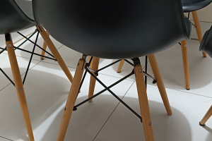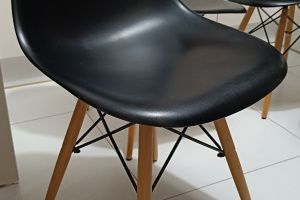 Krzesła skandynawskie 6 szt.czarne na drewnianych nogach w kolorze dębu.Siedzisko z tworzywa sztucznego łatwe do utrzymania w czystości.Używane w stanie bardzo dobrym.