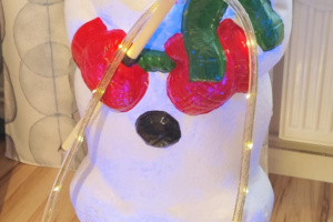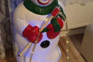 Witam na sprzedaż ręcznie robiona ozdoba świąteczna Bałwan na saniach podświetlany w różnych kolorach.