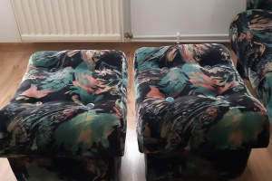 Oddam wersalkę rozkładaną oraz dwie otwierane pufy. Stan dobry, wszystko zostało wyprane. Wersalka trochę zacina się przy składaniu, normalne ślady użytkowania. Przybliżone wymiary: