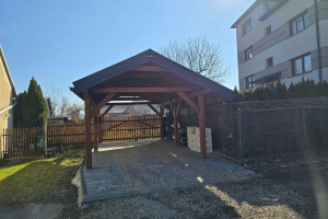 We frontowej części działki znajduje się drewniana wiata na samochód wyłożona kostką, a w głębi zlokalizowany jest wolnostojący garaż jednostanowiskowy.