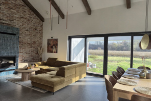 Przestronny salon z dużymi przeszkleniami i pięknym widokiem na rozległą, zieloną działkę