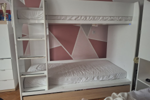 Sprzedam łóżko piętrowe NAMEK zakupione w salonie BRW. Łóżko posiada delikatne znaki użytkowania. Pod łóżkiem jest pojemna szuflada. Materace w komplecie. Wymiary 184x96cm, 159cm wysokość. Oświetlenie LED.