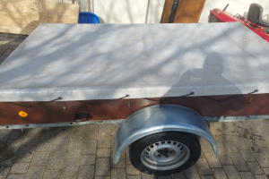 Przyczepa ma grubą twardą ramę, koła na wahaczach, konstrukcja bardzo solidna.