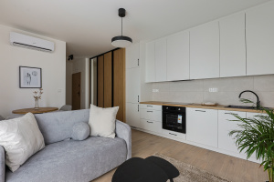 Na wynajem nowoczesna kawalerka (26 m²) w stylu Skandi w nowym bloku przy ulicy Hallera 19.