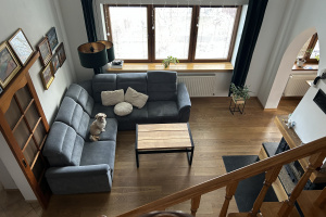 Dom jednorodzinny z poddaszem użytkowym, w zabudowie wolnostojącej o powierzchni zab. 152 m2. Budynek jest wyposażony w panele fotowoltaiczne i panele solarne. Jest ocieplony, pokryty blacho dachówką – dach wymieniony 4 lata temu, garaż w bryle budynku. Wokół domu podjazd i schody wyłożone kosatką brukową. Podłogi mieszane, drewniane, łazienka płytki. Na ścianach tynki tradycyjne cementowe, sufity na poddaszu podwieszane, stan ścian bardzo dobry. Budynek nie jest podpiwniczony. Ogrzewanie gazowe pochodzące z własnej kotłowni piecem 2 funkcyjnym oraz kominkowe. Nieruchomość posiada poddasze użytkowe, w którym znajdują się 3 sypialnie w tym 1 z balkonem oraz zadaszony taras oraz niski strych. Do budynku mieszkalnego przynależy zadaszona wiata na drugi samochód oraz drewniany budynek gospodarczy. Całość jest solidnie ogrodzona wraz z brama elektryczną.