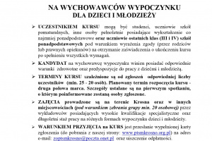 i młodzieży (kolonie, obozy, obozy wędrowne, półkolonie, dziecińce) w charakterze wychowawców lub kierowników wypoczynku. Kursy organizowane są na podstawie zezwolenia Podkarpackiego Kuratora Oświaty w Rzeszowie (Nr WA.5632.7.2026.JM