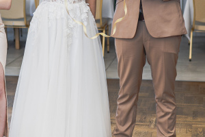 Suknia w kolorze ecru, zdobiona koronką z kwiatami i listkami 3D, cekinami i koralikami. Sznurowana na gorset (wewnątrz), a następnie zapinana na ozdobne perłowe guziki. Dół sukni wzbogacony jest o rozcięcie na prawej nodze, który pięknie prezentuje się w ruchu.