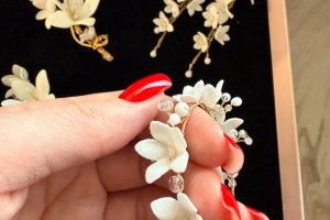- Spinki – „Helia” dwie spinki do włosów z kwiatkami i kryształkami – 150 zł (jedna ze spinek ma poderwany jeden kwiatek, widoczne na zdjęciu)