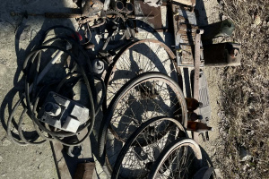 Koła, stare okulary do spawania, bagażnik od rometa, lampa od motoru, stary żeliwny zawias, drzwi z kuchni kaflowej. stara siła na kablu, koła od starego roweru itd