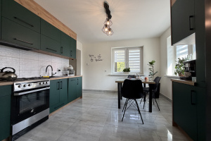 Powierzchnia użytkowa domu wynosi około 80 m², natomiast całkowita powierzchnia to około 144 m². Do domu dobudowany jest budynek gospodarczy, który można przekwalifikować według uznania. Część mieszkalna znajduje się na podwyższonym parterze i obejmuje salon, sypialnię, pokój gościnny, kuchnię, łazienkę i korytarz. Na niższym poziomie znajduje się piwnica, w której wydzielono trzy pomieszczenia oraz garaż o powierzchni około 28m2 z drzwiami wjazdowymi otwieranymi na pilota.