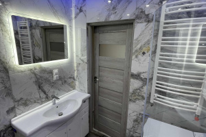 W mieszkaniu centralne ogrzewanie niezależne (zasilane własnym piecem dwufunkcyjnym kondensacyjnym gazowym, stąd w okresie letnim, kiedy nie ogrzewamy mieszkania, nie ponosimy opłat za ogrzewanie), ogrzewanie podłogowe w przedpokoju, salonie, kuchni i łazience ; na całej powierzchni mieszkania ułożone płytki wielkogabarytowe, w aneksie kuchennym meble, wyspa kuchenna z płytą indukcyjną i piekarnikiem oraz łazienka z kabiną prysznicową.