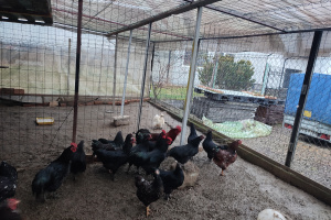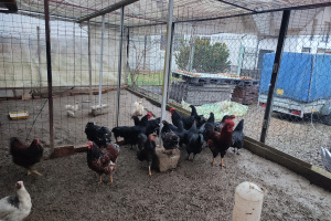 Koguty Astralorp i Wayendotte brązowo nakrapiane zmienią kurnik. Koguty z sierpnia 2025 r.