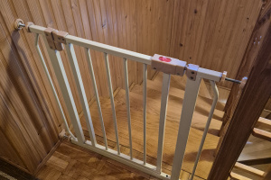 Bramka zabezpieczająca na schody. Używana. Szerokość 72 - 82 cm. Wysokość 76 cm. Metalowa, kolor jasny kremowy. Łatwy bezinwazyjny montaż. Odbiór osobisty Jedlicze.