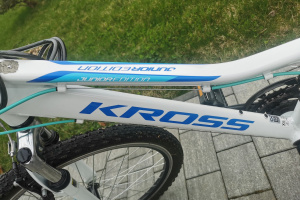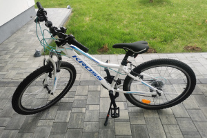 Sprzedam rower dziecięcy Kross (biały z niebieskimi napisami). Rozmiar ramy XS, średnica kół 24 cale. Rower w bardzo dobrym stanie.