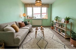 Przestronny Salon: Sercem mieszkania jest jasny pokój w świeżym, miętowym kolorze, który idealnie sprawdzi się jako strefa wypoczynku i jadalnia. Z salonu prowadzi wyjście na balkon/taras, co optycznie powiększa przestrzeń.