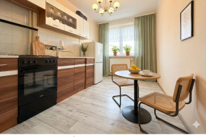 Oddzielna, Widna Kuchnia: Funkcjonalna zabudowa kuchenna w ciepłych odcieniach drewna i bieli. Kuchnia jest w pełni wyposażona (kuchenka, piekarnik, lodówka) i posiada okno, co zapewnia świetną wentylację.