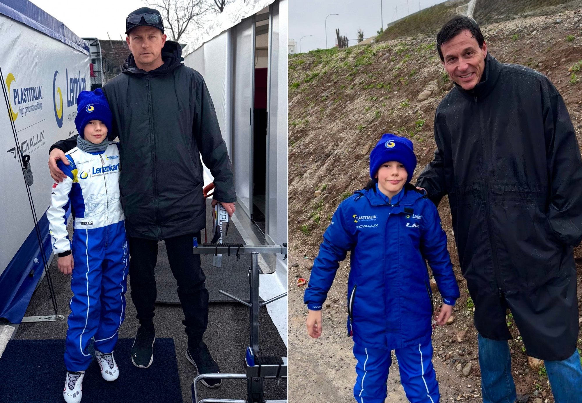 Po lewej Hugo z Kimi Räikkönenem, mistrzem świata Formuły 1, po prawej z Toto Wolffem, byłym kierowcą i obecnym dyrektorem generalnym i szefem zespołu Mercedes F1