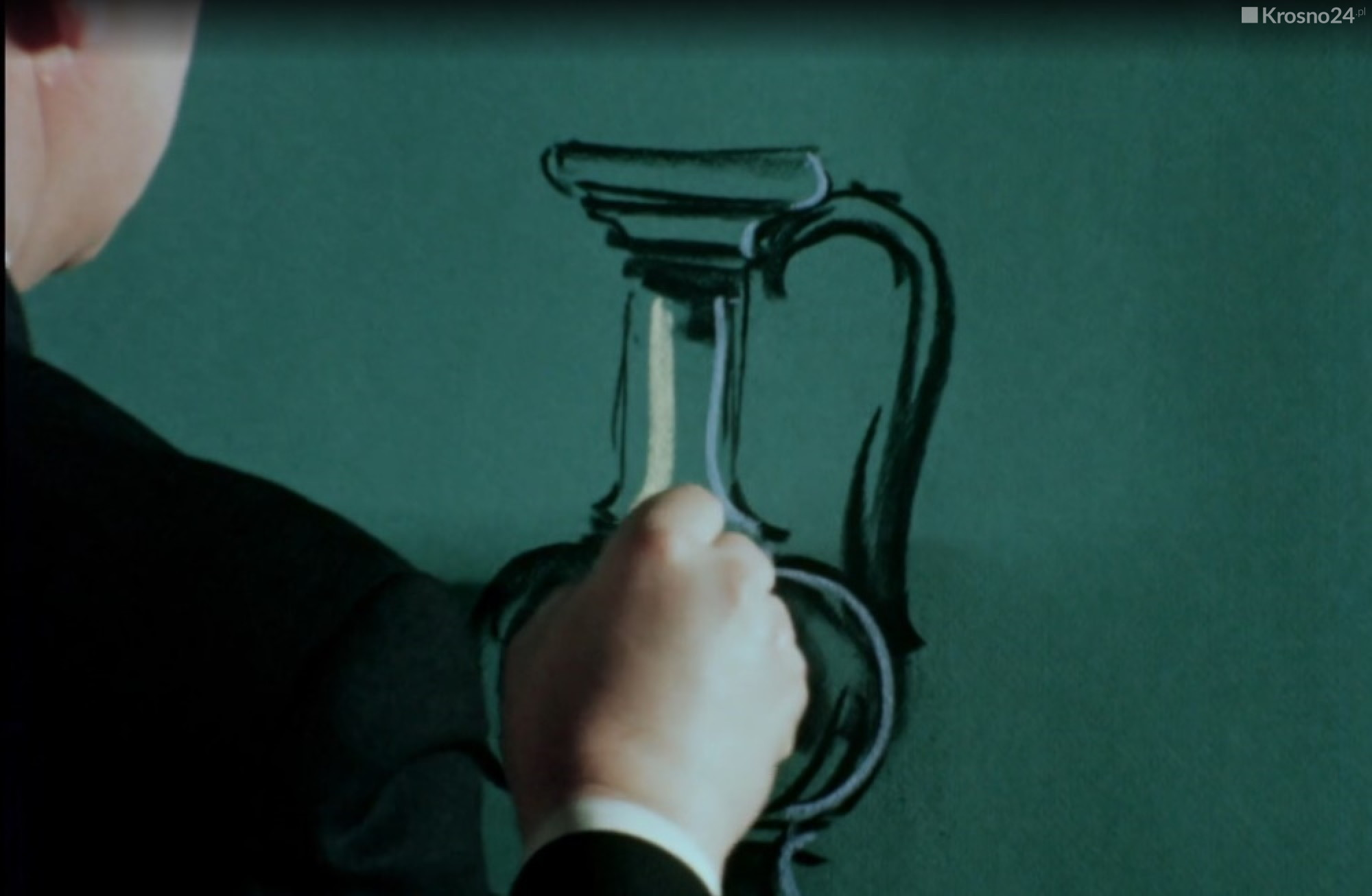 W trakcie, gdy hutnicy tworzą szklany pucharek, prof. Zin opowiada widzom o historii powstania szkła. Swoją opowieść rozpoczyna malowniczo - od światła księżyca odbijającego się w tafli wody i od sopli lodu zwisających z krawędzi dachu. Jednocześnie kilkoma wprawnymi pociągnięciami węgla i kredy, szkicuje ilustracje do swojej opowieści.