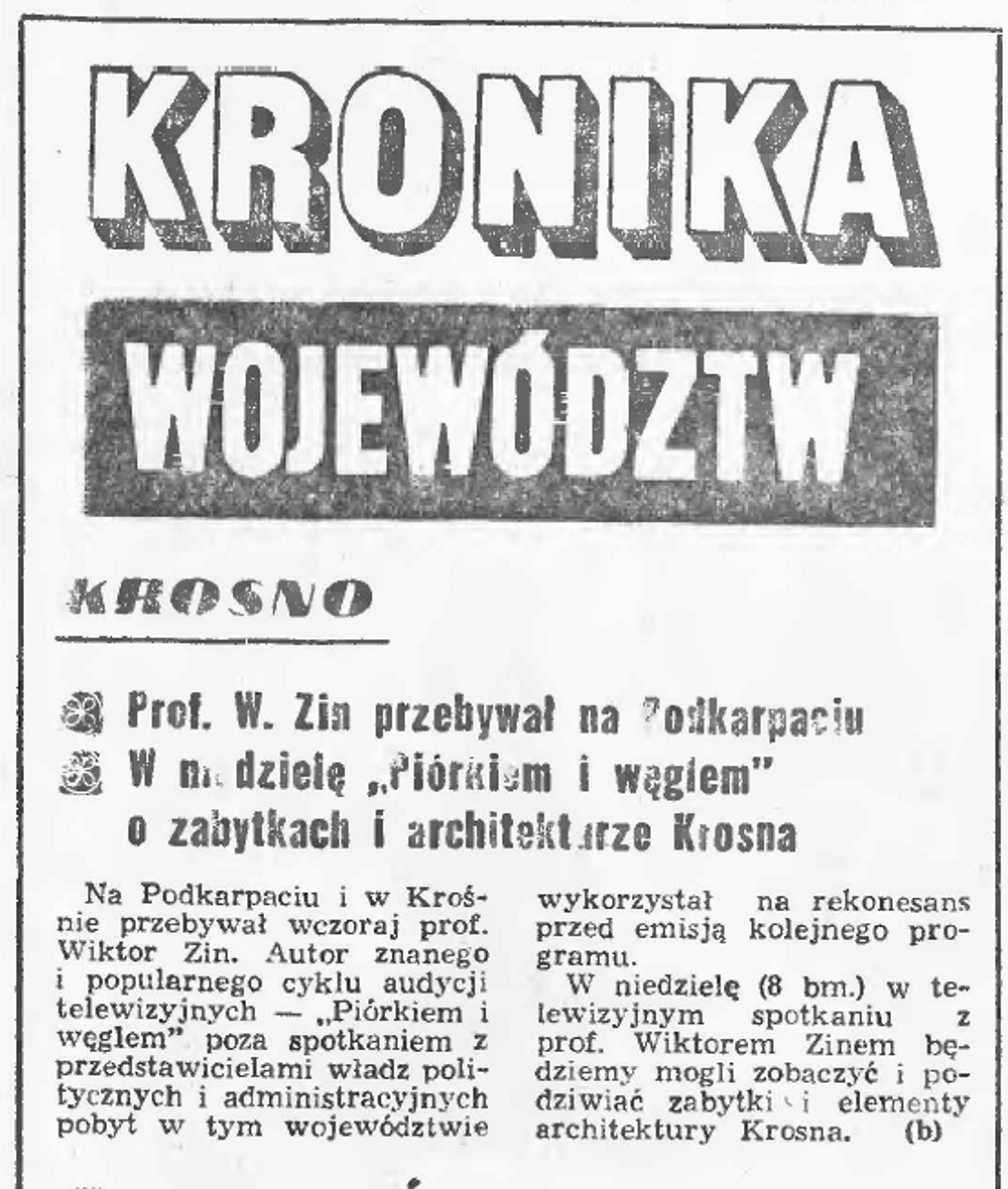 Wiktor Zin odwiedził też Krosno w 1980 roku jako wiceminister kultury i sztuki oraz generalny konserwator zabytków. Przewodniczył komisji do spraw rewaloryzacji miast i zespołów staromiejskich. Spotkanie dotyczyło modernizacji krośnieńskiej starówki. - Dzięki niemu Krosno zostało wpisane na listę miast, które miały jako pierwsze otrzymać dotację na rewaloryzację zespołów staromiejskich - mówi Zdzisław Gil.