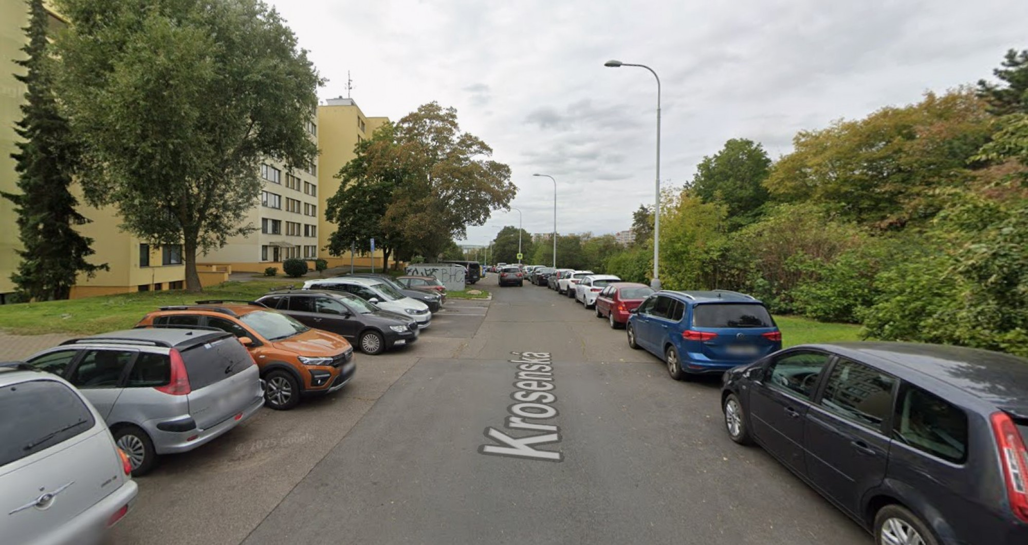 Krosenská w Pradze to ciasna ulica, przy której parkują mieszkańcy bloków