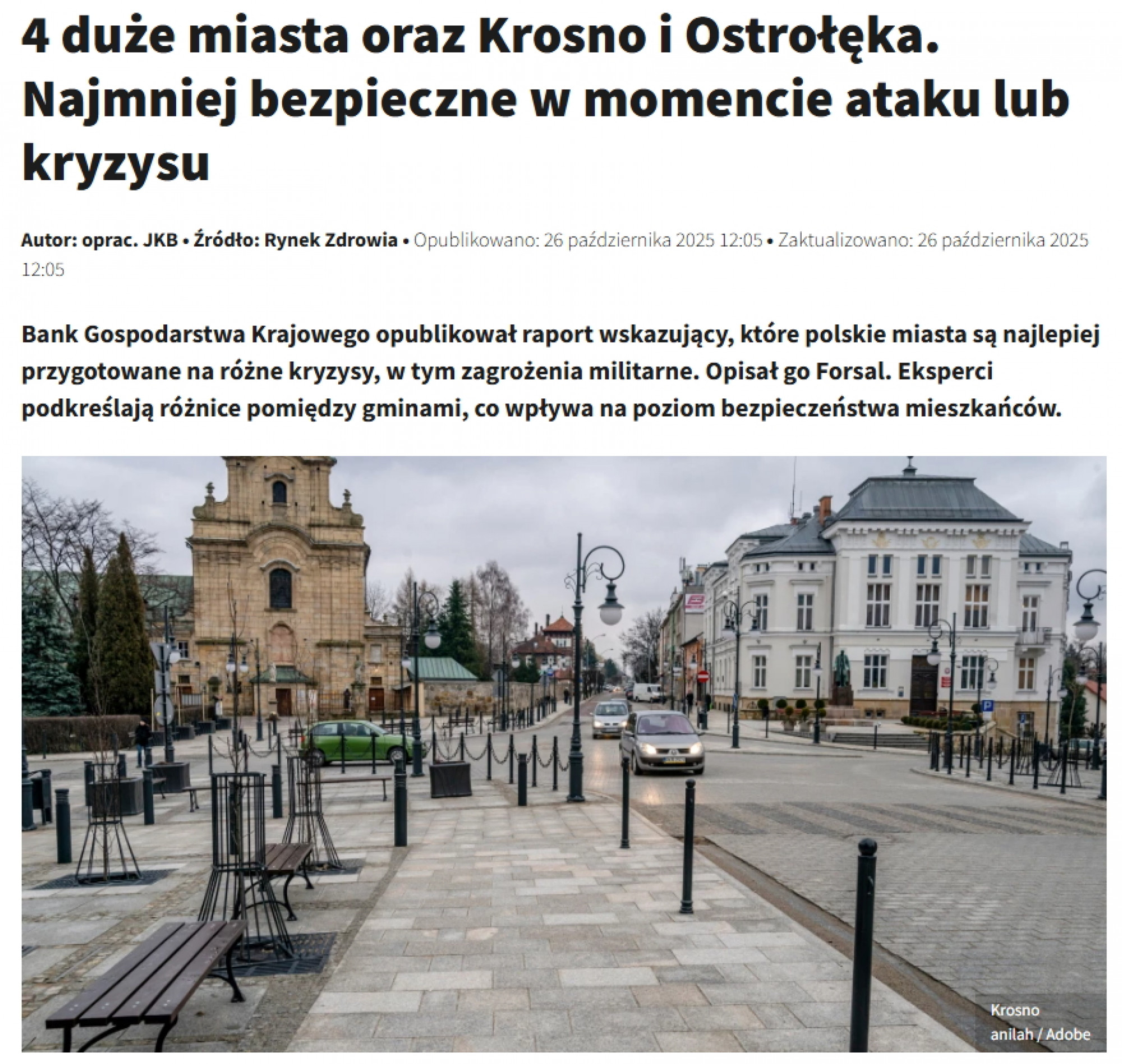 Podobnie jak inne duże ośrodki, Krosno jest miastem względnie zagrożonym, ale ponadprzeciętnie odpornym, co oznacza, że choć nasza "warownia" może być celem, to ma siłę finansową, infrastrukturę i społeczną gotowość, by skutecznie stawić czoła kryzysom.
