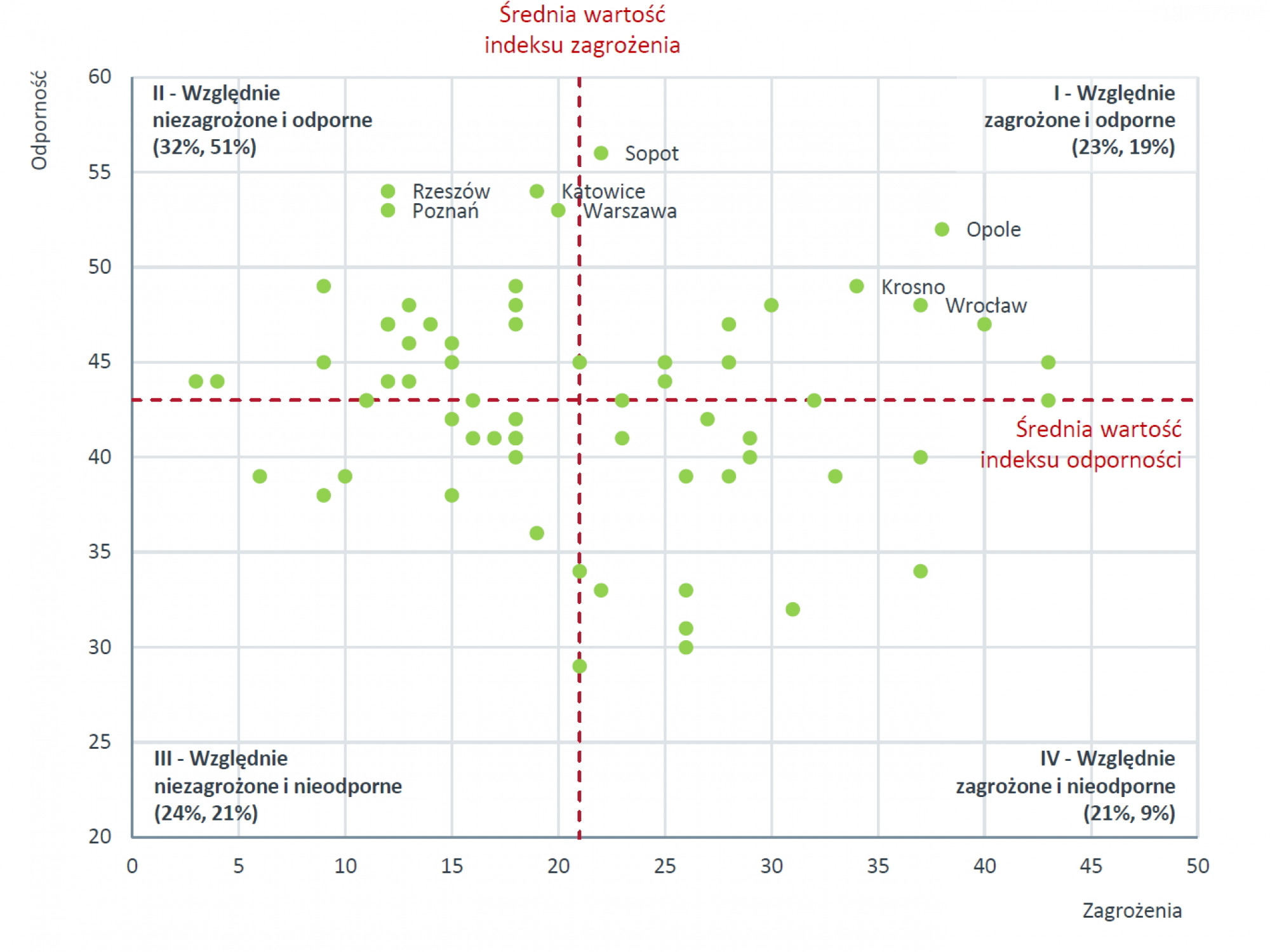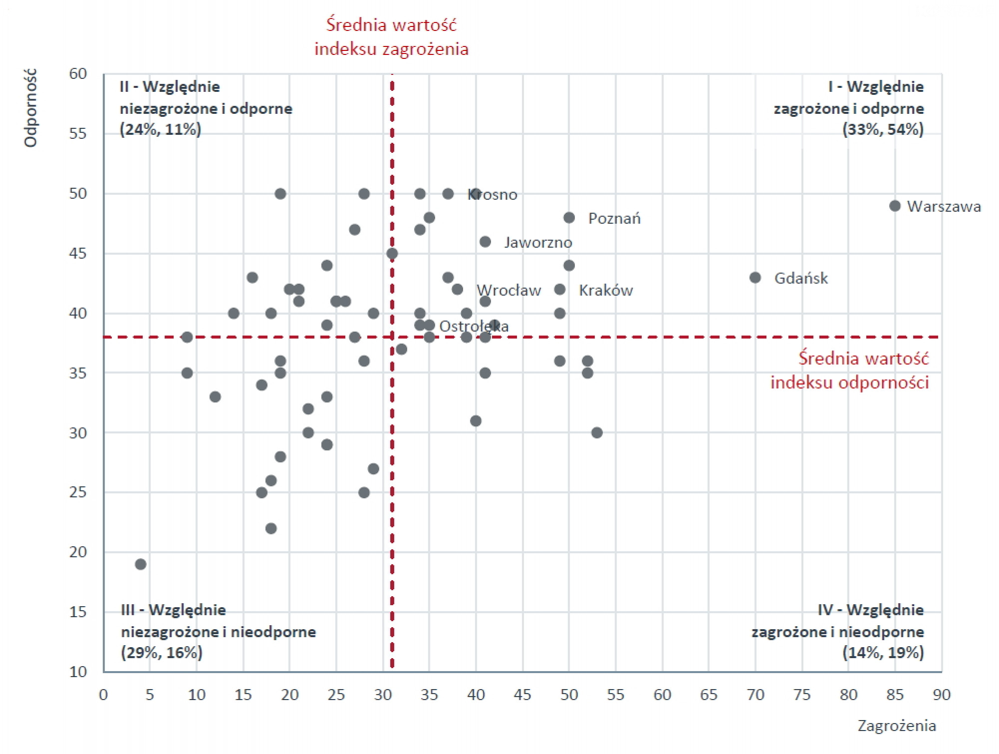 Co to oznacza dla Krosna? Wraz z największymi metropoliami (Warszawa, Gdańsk, Kraków) i innymi miastami (Ostrołęka, Jaworzno), Krosno znalazło się w grupie miast z podwyższonym zagrożeniem, które jednocześnie ma ponadprzeciętną odporność (IOM).