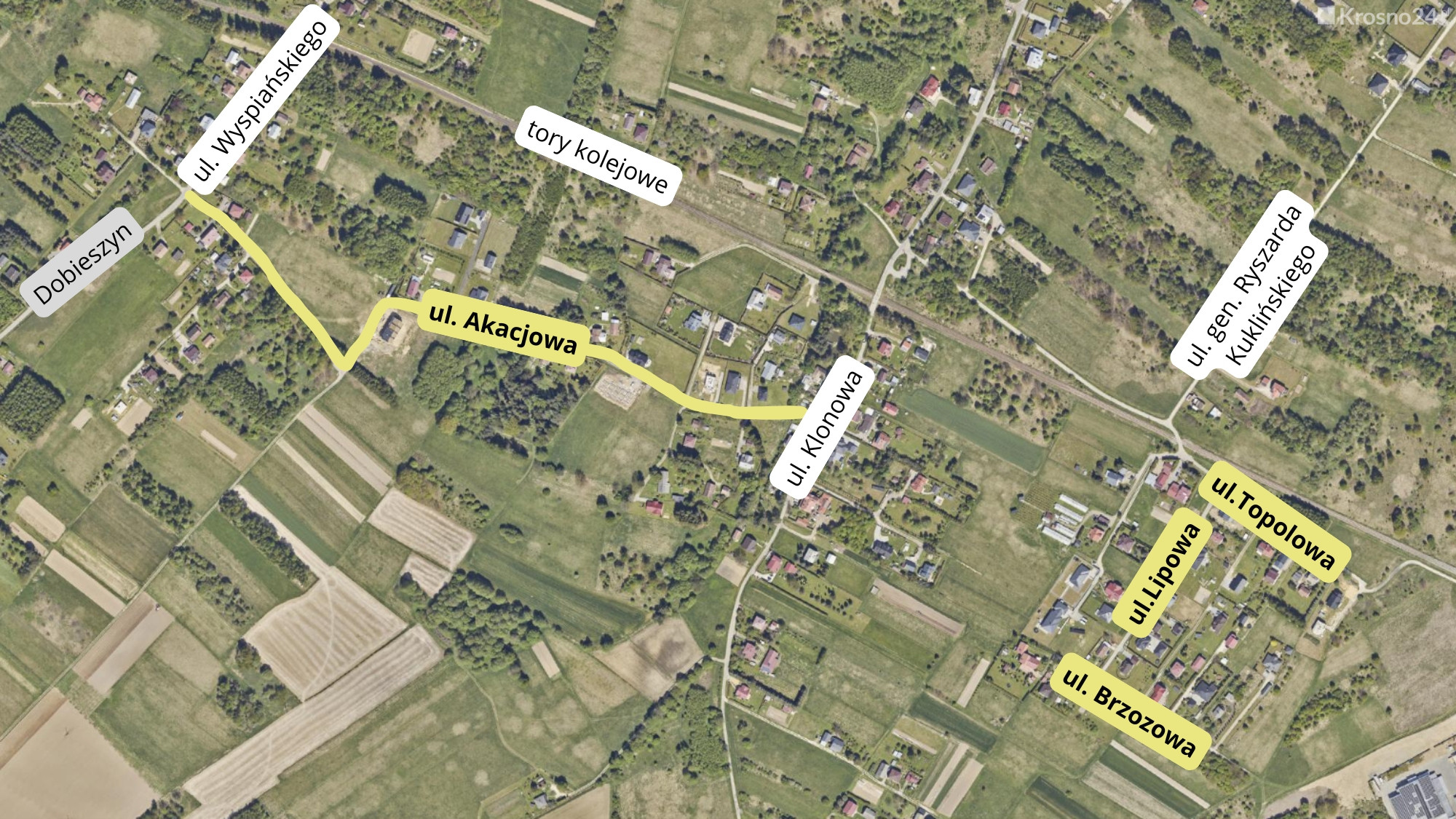 Najdłuższa z odnóg (granicząca z ul. Wyspiańskiego i Dobieszynem) zyska miano ul. Akacjowej. Kolejne będą nazywać się Brzozowa, Lipowa oraz Topolowa.