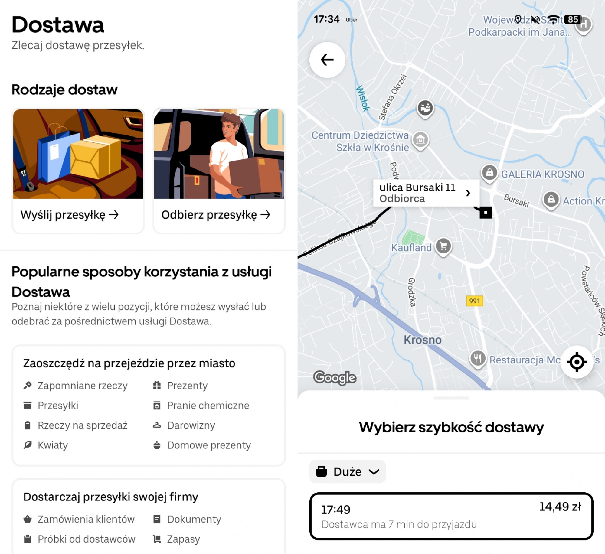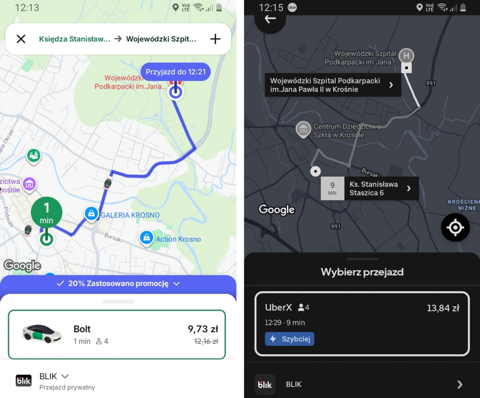 Chociaż Uber powstał parę lat przed Boltem i szybciej pojawił się w Polsce, to później otworzył się na mniejsze miasta, takie jak Krosno. Z Boltów możemy korzystać od maja 2024 roku, z Ubera – od początku listopada tego roku.
