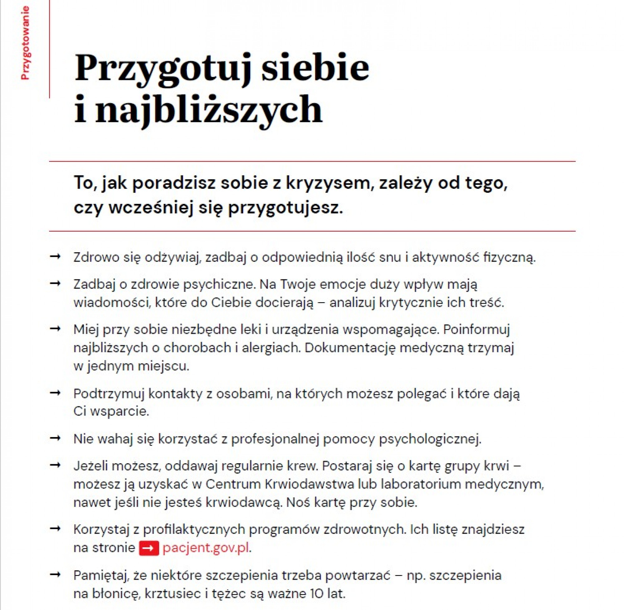 Z poradnika dowiemy się m.in. jak przygotować swój dom i rodzinę, co zabrać w przypadku ewakuacji, jak postępować podczas powodzi czy ataku z powietrza oraz jak udzielać pierwszej pomocy.