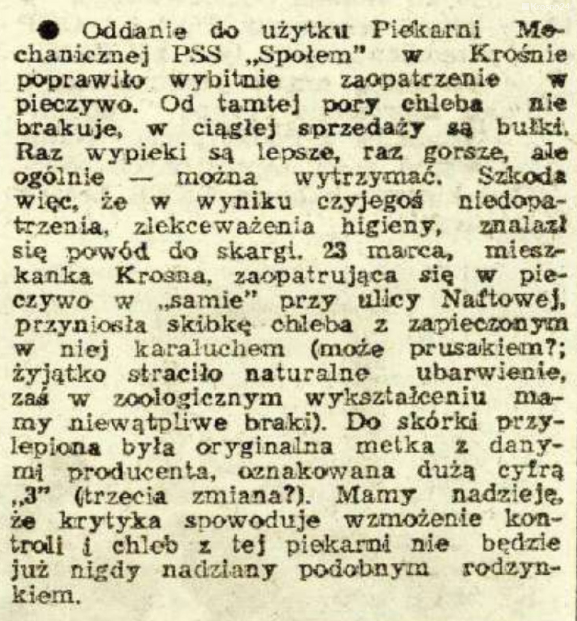 Rok później, w 1988 roku, w tygodniu "Podkarpacie" ukazała się notka ilustrująca, że nie zawsze ilość pieczywa szła w parze z jego jakością. Jedna z mieszkanek Krosna skarżyła się gazecie, że znalazła w chlebie "zapieczonego karalucha". Redakcja komentowała: Mamy nadzieję, że krytyka spowoduje wzmożenie kontroli i chleb z tej piekarni nie będzie już nigdy nadziany podobnym rodzynkiem: