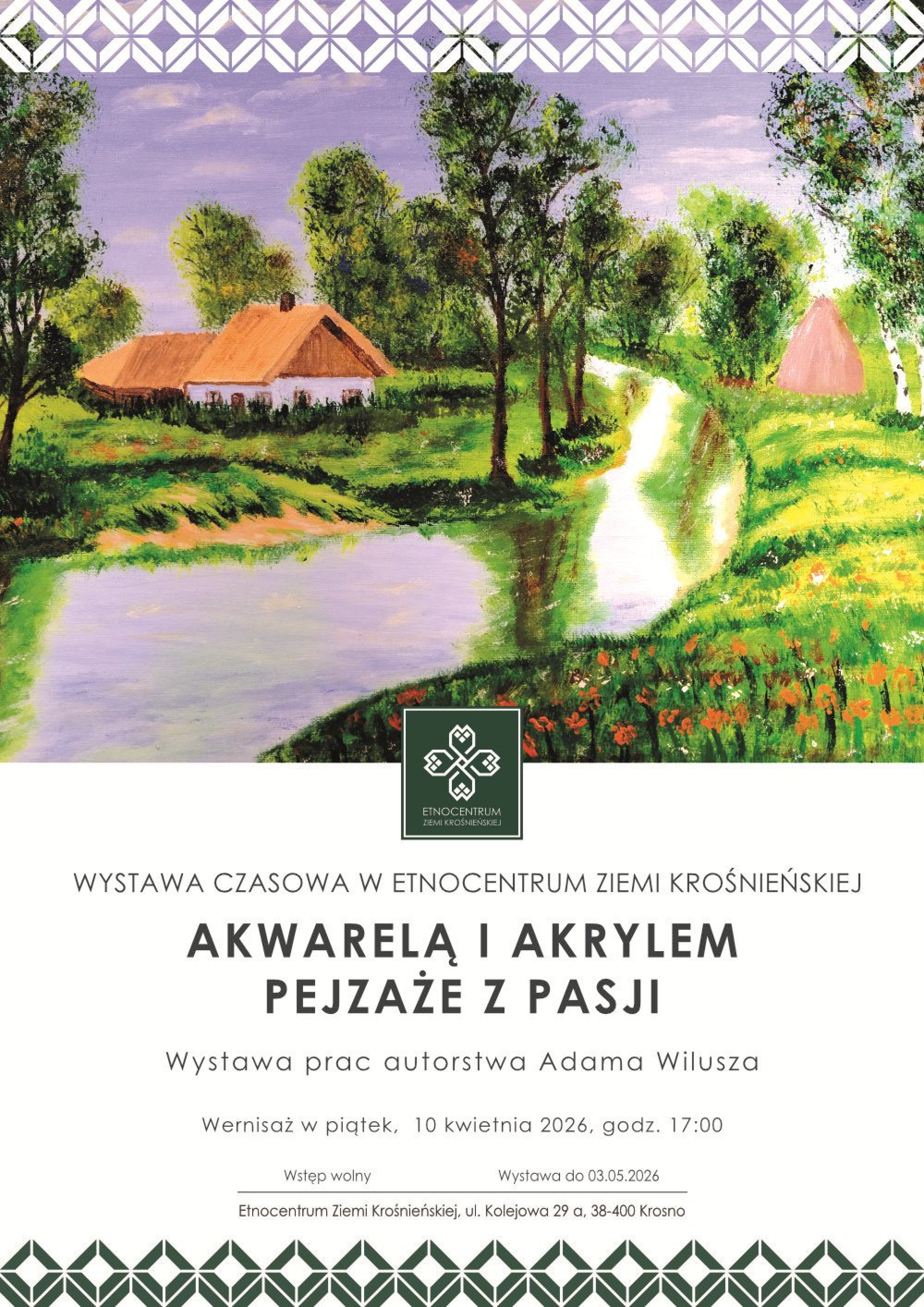 W kwietniu, w Galerii wystaw czasowych Etnocentrum, zobaczyć będzie można ekspozycję prac Adama Wilusza, lokalnego pasjonata malarstwa, zatytułowaną "Akwarelą i akrylem - pejzaże z pasji". Wernisaż odbędzie się 10 kwietnia (piątek) o godz. 17:00.