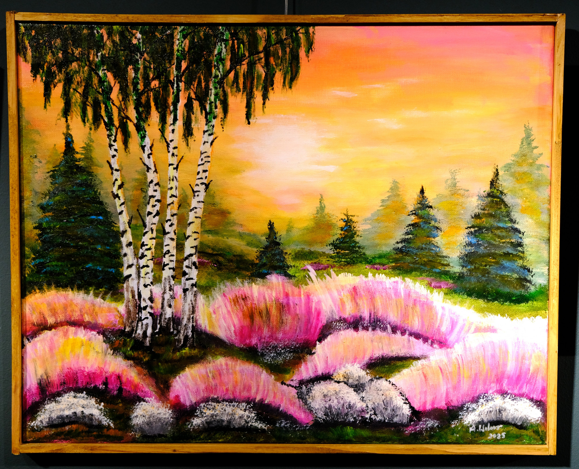Obrazy przedstawiające wiejskie pejzaże, pogórzańskie krajobrazy, ptaki i kwiaty wykonane zostały w technikach akwareli i akrylu.