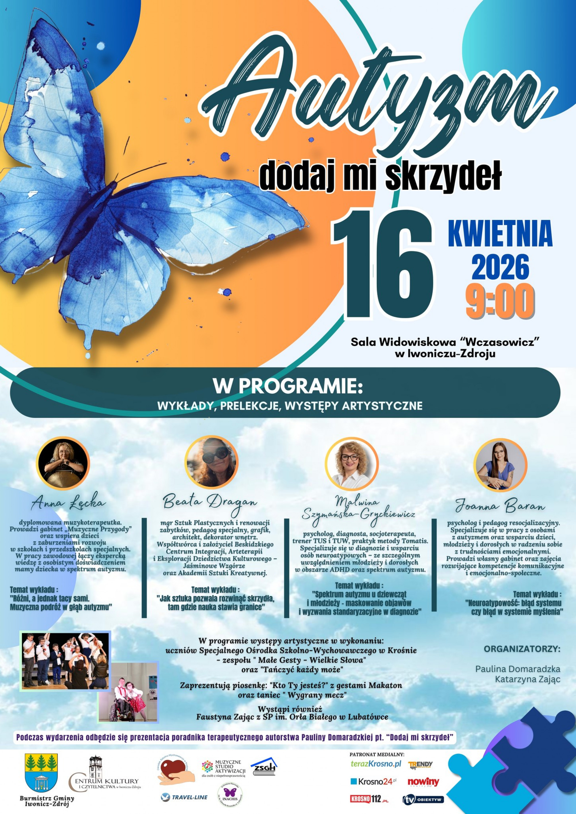 "Autyzm. Dodaj mi skrzydeł" - pod takim hasłem 16 kwietnia (czwartek) o godz. 9:00 w Sali Widowiskowej "Wczasowicz" odbędzie się wydarzenie poświęcone tematyce spektrum autyzmu. Poruszone zostaną cztery niezwykle ważne zagadnienia, a swoją wiedzą i doświadczeniem podzielą się zaproszone prelegentki.