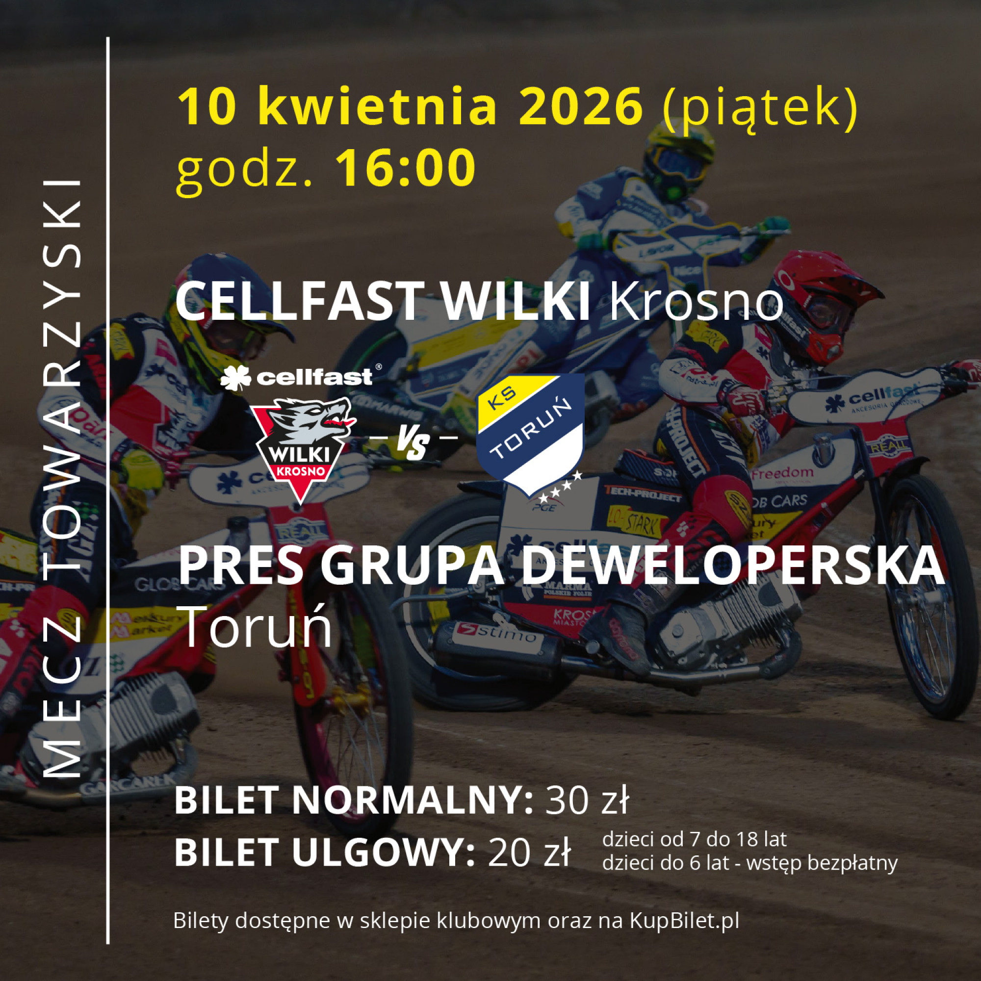 Uwaga! Na mecz z PRES Grupą Deweloperską Toruń zachowują ważność wszystkie zakupione bilety na odwołany mecz Cellfast Wilki Krosno – Innpro ROW Rybnik, który pierwotnie miał odbyć się przy Legionów w niedzielę 29 marca 2026.