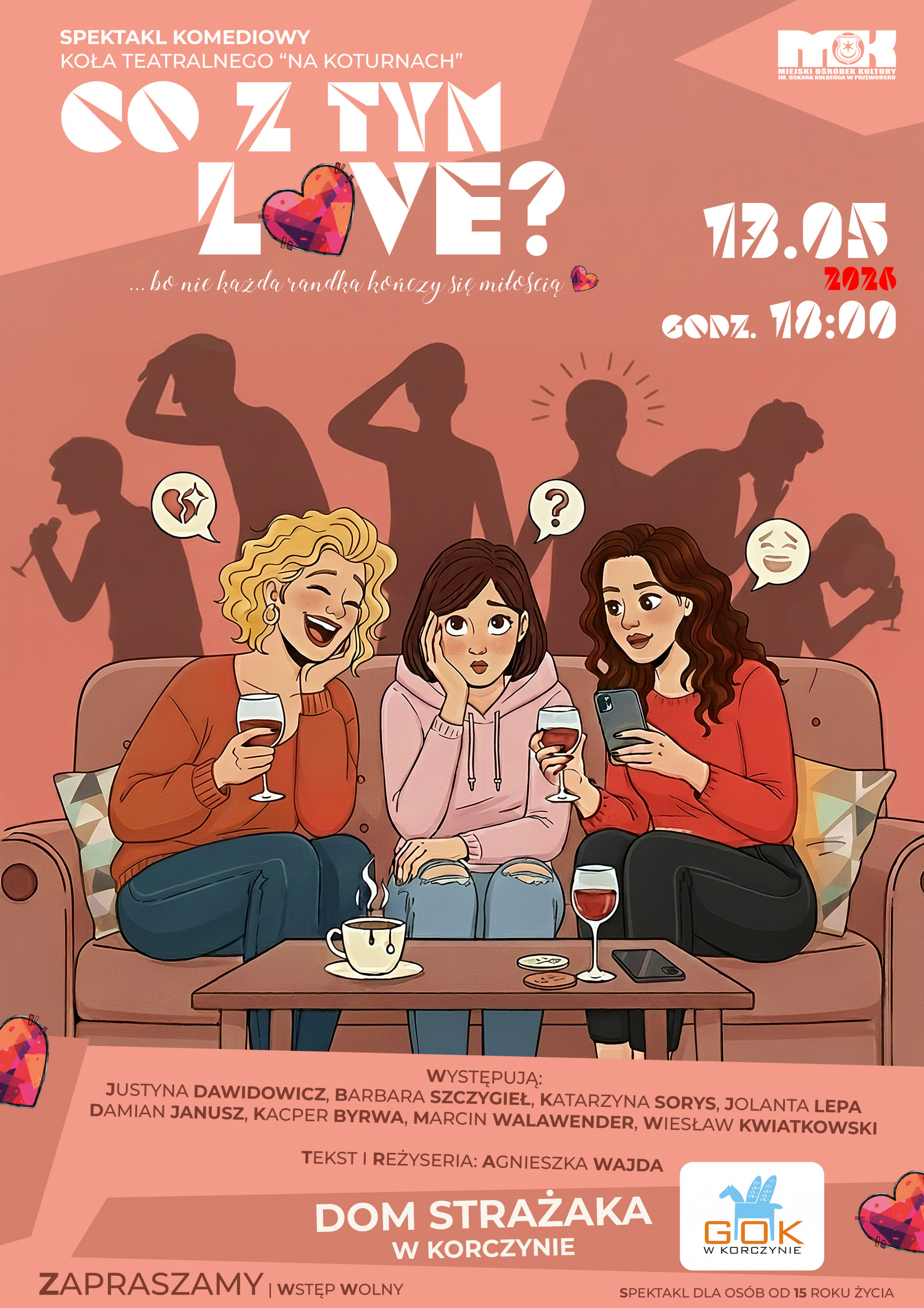 Gminny Ośrodek Kultury w Korczynie zaprasza na spektakl "Co z tym love?" w wykonaniu grupy teatralnej "Na koturnach" z Miejskiego Ośrodka Kultury w Przeworsku, który odbędzie się 13 maja (środa) w Sali Widowiskowej Domu Strażaka w Korczynie.