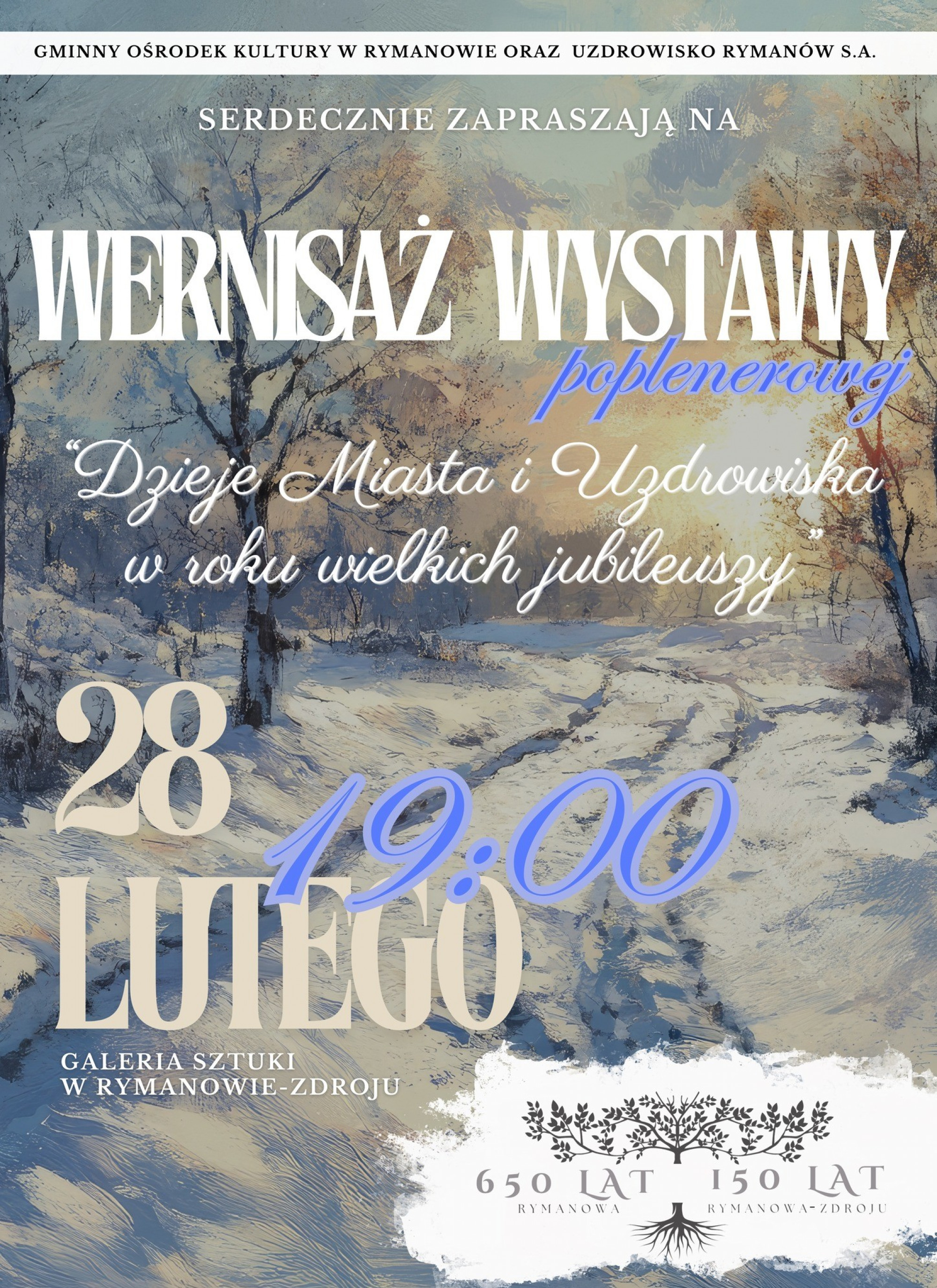 Gminny Ośrodek Kultury w Rymanowie i Uzdrowisko Rymanów S.A. zapraszają na wernisaż wystawy poplenerowej "Dzieje Miasta i Uzdrowiska w Roku Wielkich Jubileuszy”.