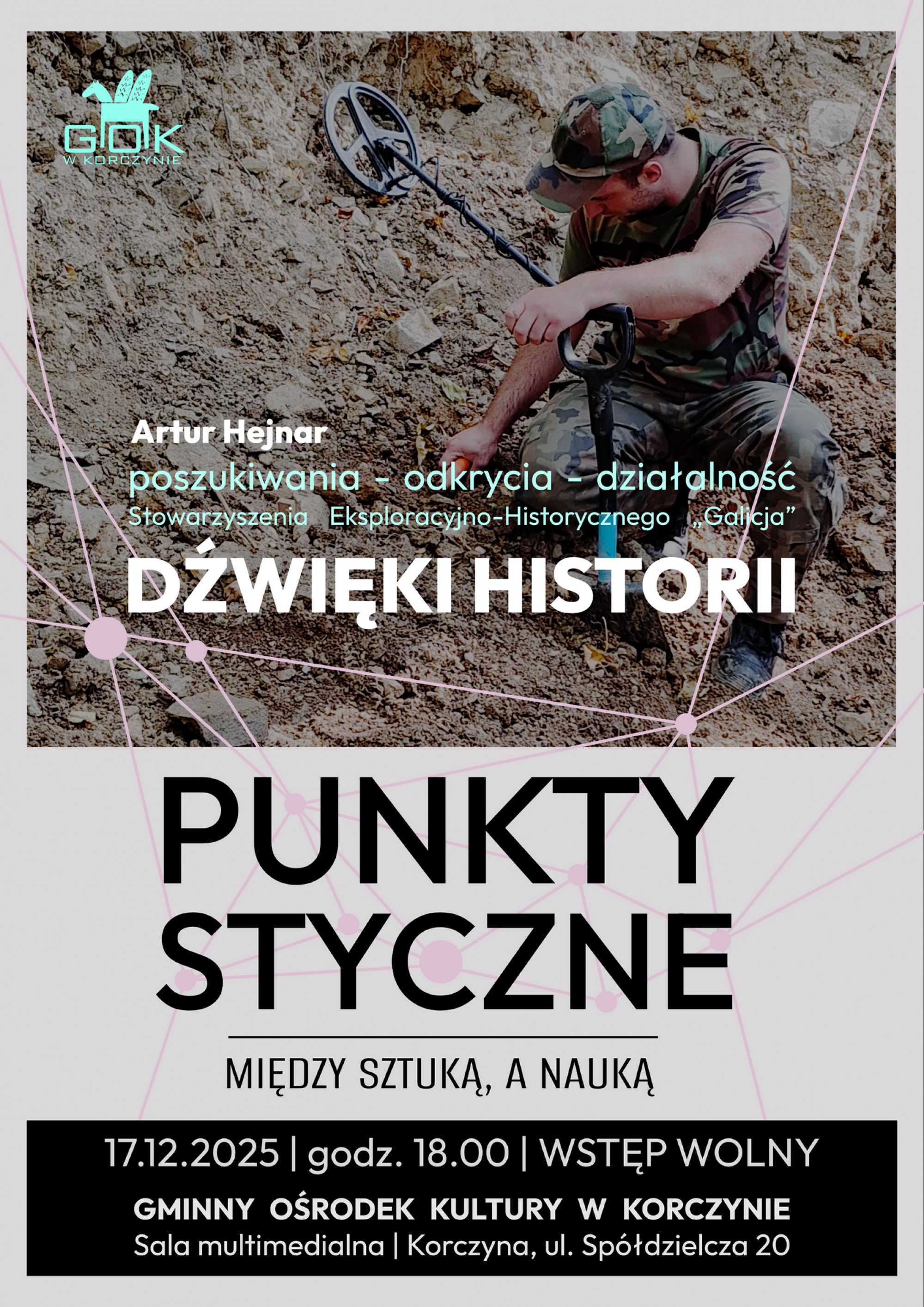 Gminny Ośrodek Kultury w Korczynie wraz ze Stowarzyszeniem Eksploracyjno-Historycznym „Galicja” zapraszają na ostatnie w 2025 r. spotkanie z cyklu „Punkty styczne – między sztuką, a nauką”, które odbędzie się 17 grudnia (środa) o godz. 18.00 w klimatycznych wnętrzach Dworu Szeptyckich.
