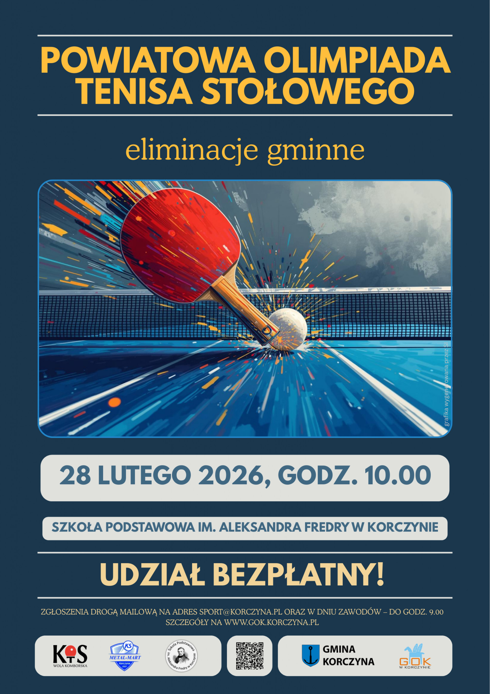 Już 28 lutego (sobota) o godz. 10.00 w hali sportowej przy Szkole Podstawowej w Korczynie odbędą się Eliminacje Gminne do Powiatowej Olimpiady Tenisa Stołowego - 2026. - To doskonała okazja, by sprawdzić swoje umiejętności, poczuć sportowe emocje i powalczyć o awans do etapu powiatowego - zachęcają organizatorzy.
