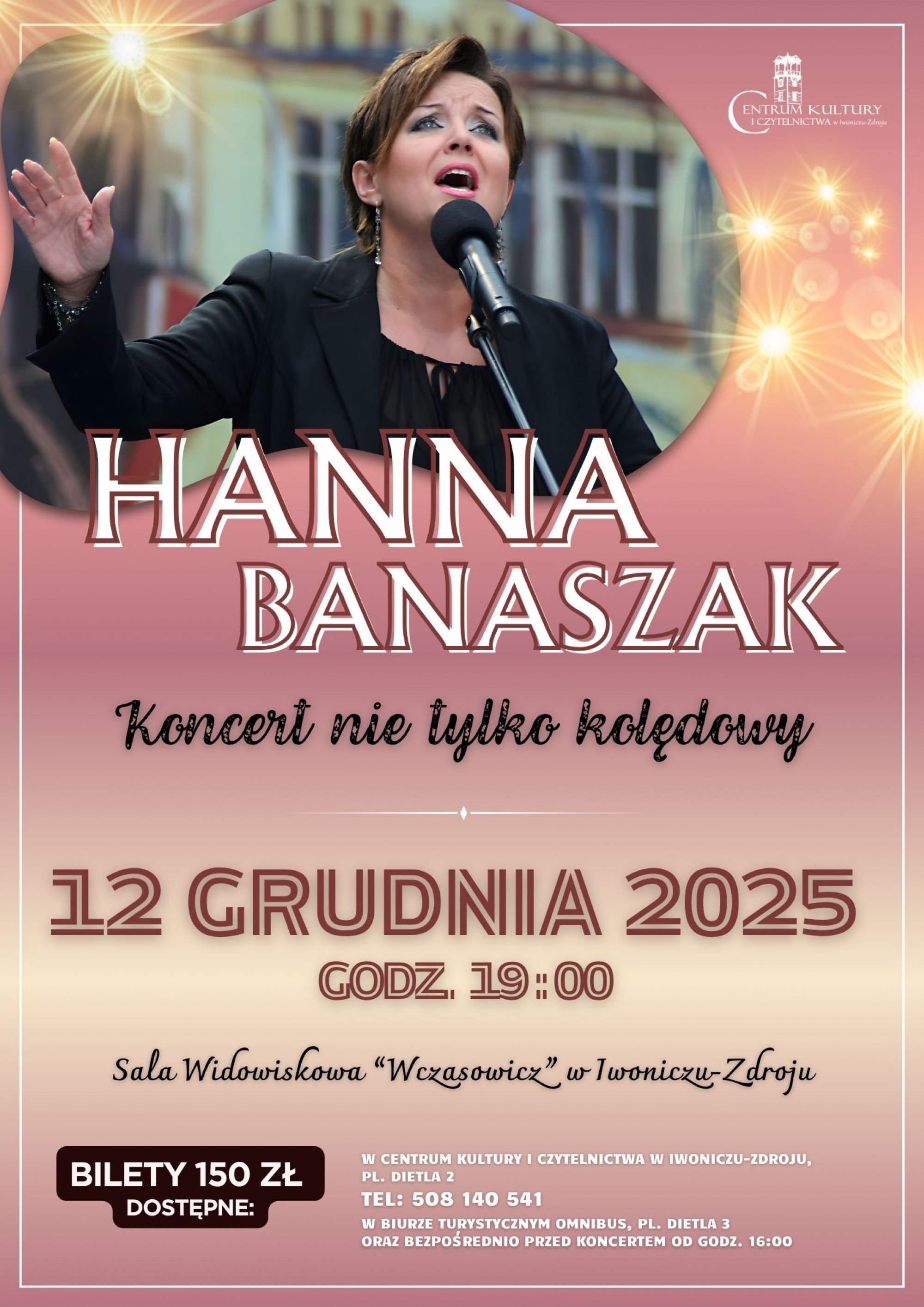 Centrum Kultury i Czytelnictwa w Iwoniczu-Zdroju zaprasza na "Koncert nie tylko kolędowy", który odbędzie się 12 grudnia (piątek) o godz. 19:00 w Sali Widowiskowej Wczasowicz w Iwoniczu-Zdroju. Na scenie jedna z najwybitniejszych polskich wokalistek jazzowych i estradowych - Hanna Banaszak.