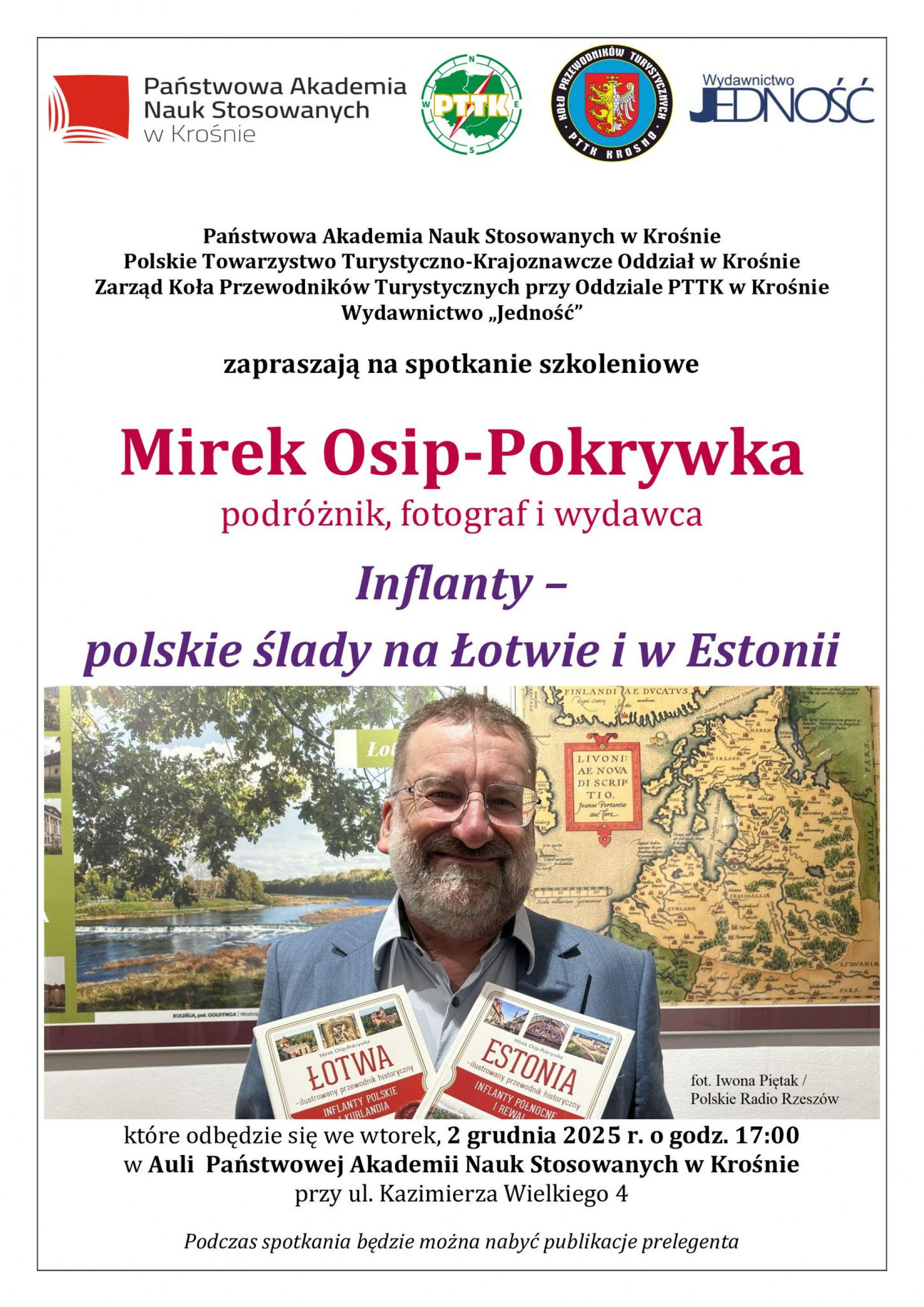 Państwowa Akademia Nauk Stosowanych w Krośnie, PTTK Krosno, Koło Przewodników Turystycznych przy PTTK Krosno oraz Wydawnictwo "Jedność" zapraszają na spotkanie pt. "Infanty - polskie ślady na Łotwie i w Estonii". Odbędzie się ono 2 grudnia o godz. 17:00 w Auli PANS Krosno (ul. Kazimierza Wielkiego 4).