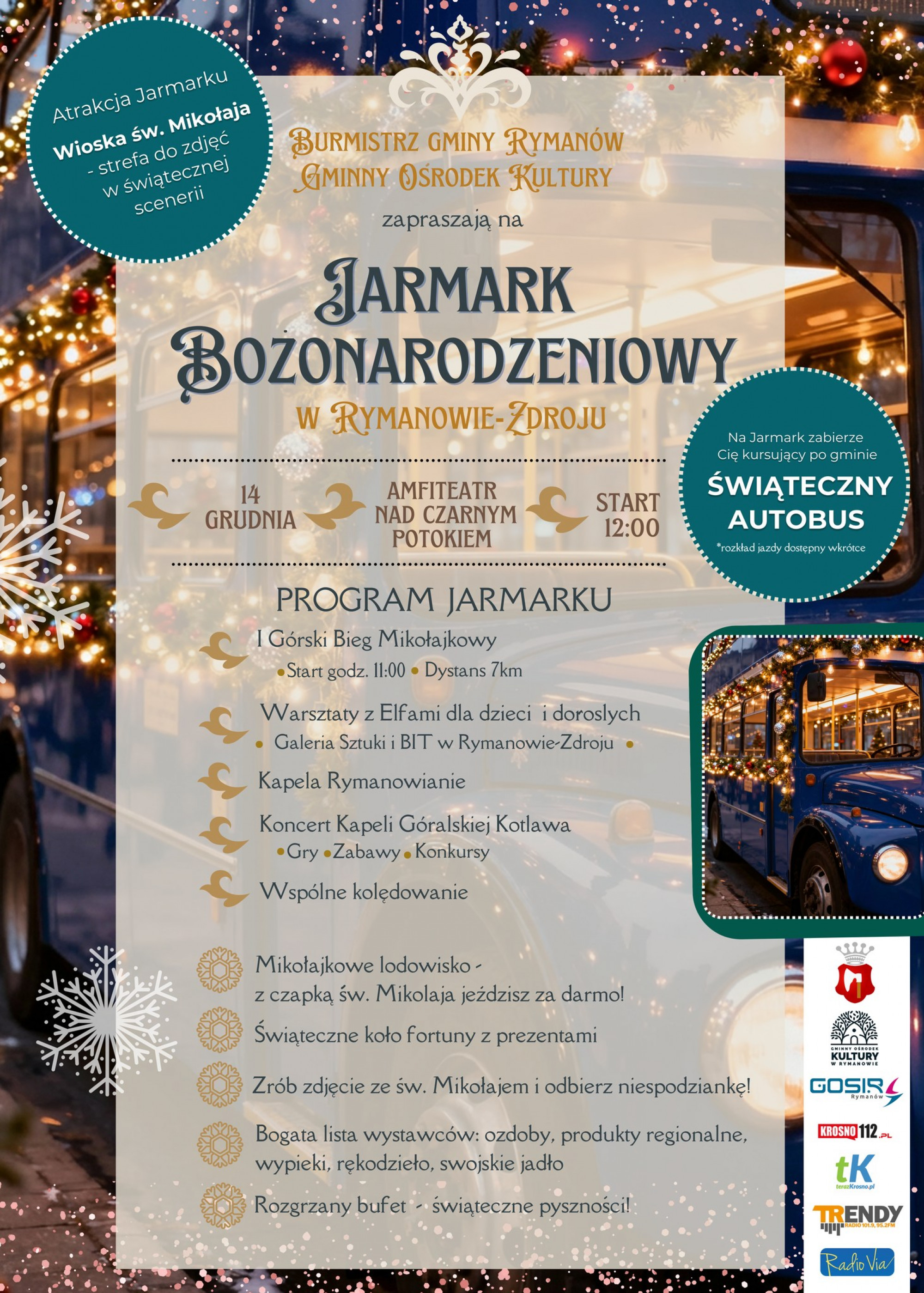 Gminny Ośrodek Kultury w Rymanowie zaprasza na pełen świątecznego klimatu Jarmark Bożonarodzeniowy, który odbędzie się 14 grudnia (niedziela) w magicznym Amfiteatrze nad Czarnym Potokiem w Rymanowie-Zdroju. Początek o godz. 12:00.