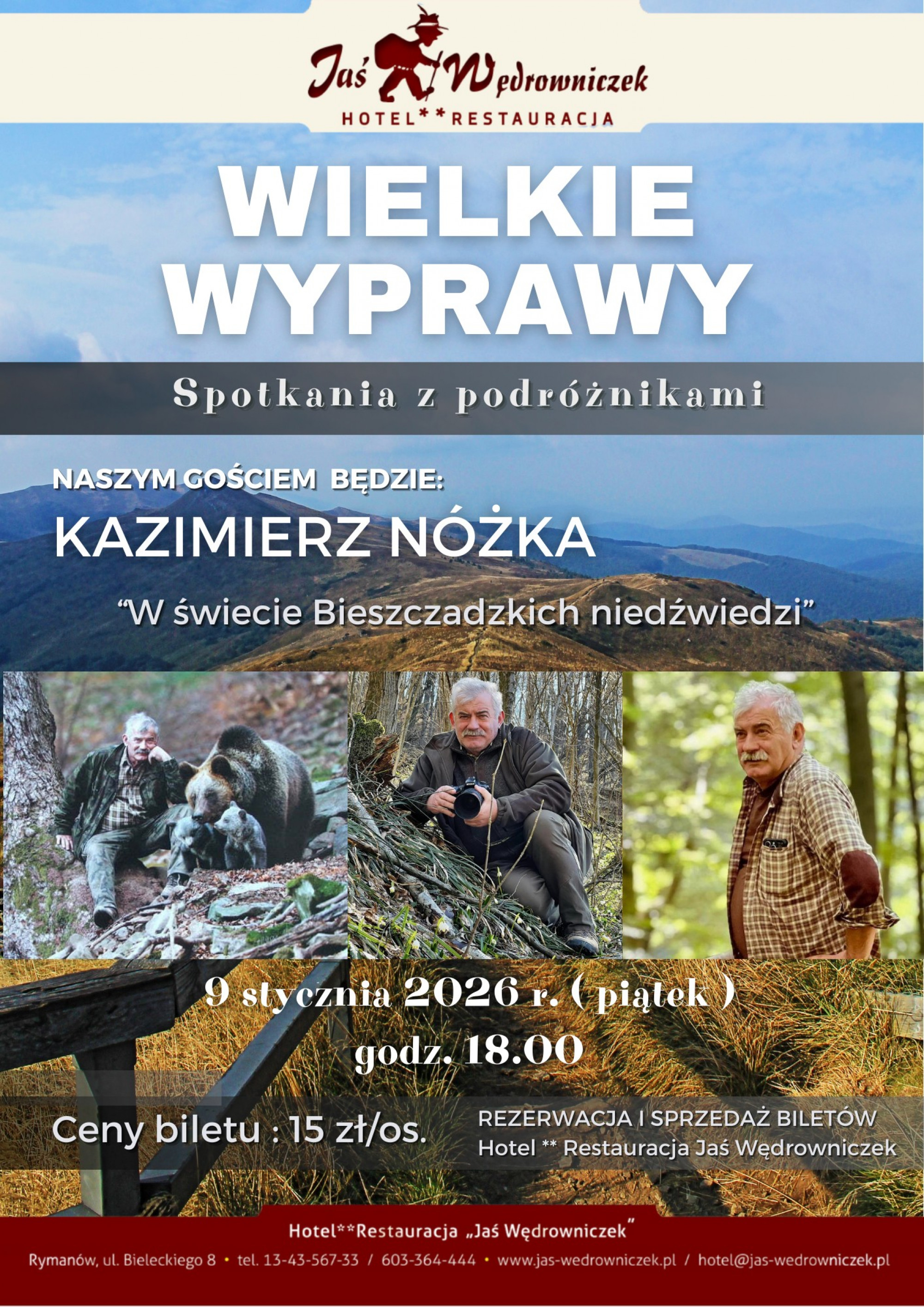 - Zajrzyj z nami w głąb lasu… z najlepszym przewodnikiem - Kazimierzem Nóżką - Hotel Restauracja Jaś Wędrowniczek zaprasza na wyjątkowe spotkanie z cyklu "Wielkie Wyprawy", które odbędzie się 9 stycznia (piątek) o godz. 18:00.